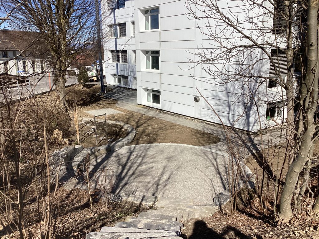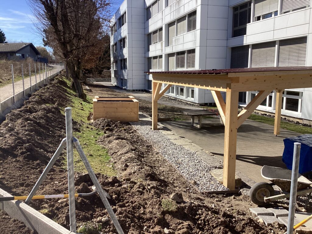Der Pausenplatz Süd wurde eigentlich schon eröffnet und fertig gestellt, trotzdem gibt es immer wieder kleine Veränderungen. Die Arena für die Jugendlichen ist mittlerweile fertig gestellt, nun wird sie mit dem Frühling aber noch eingegrünt.
