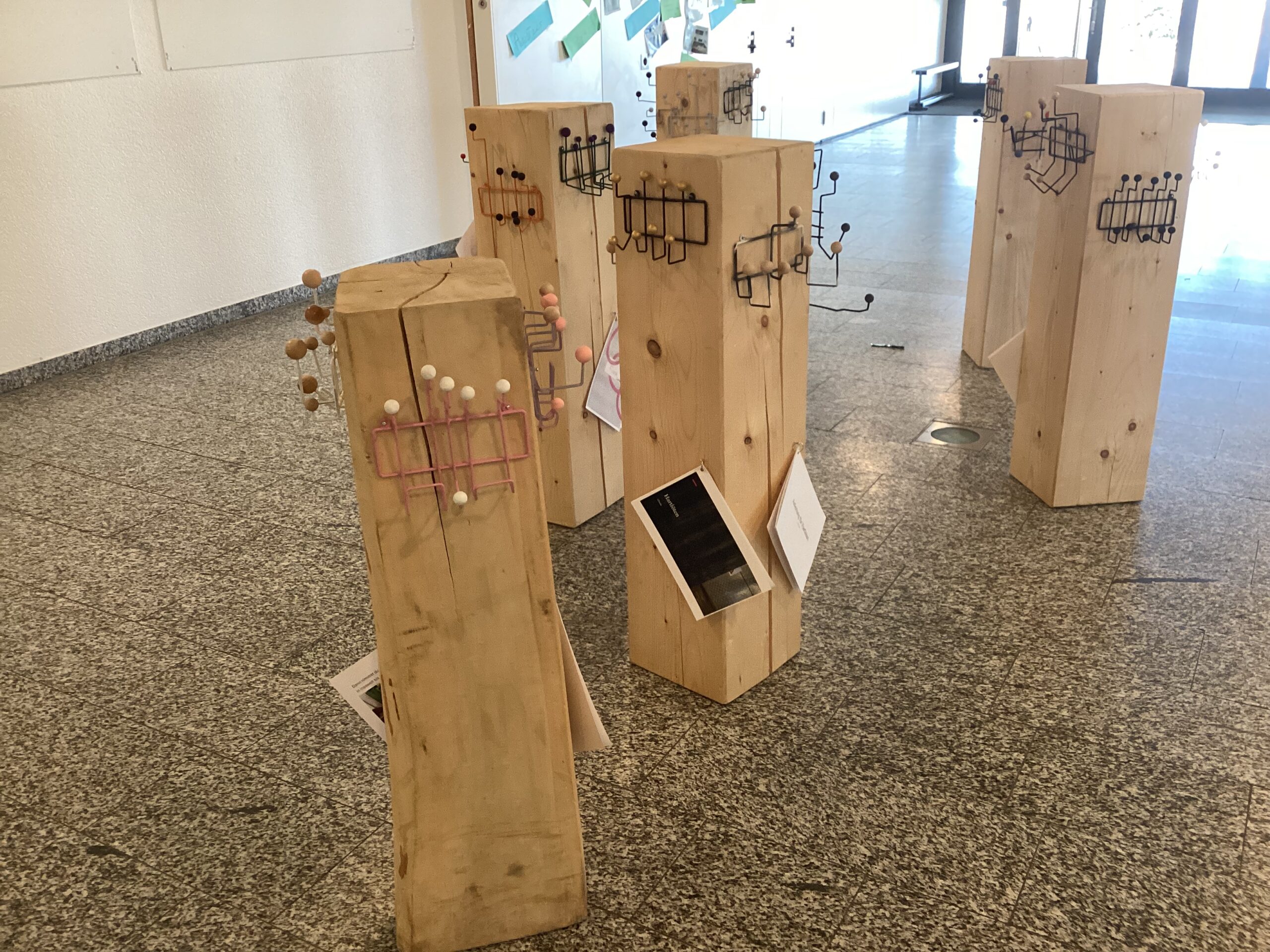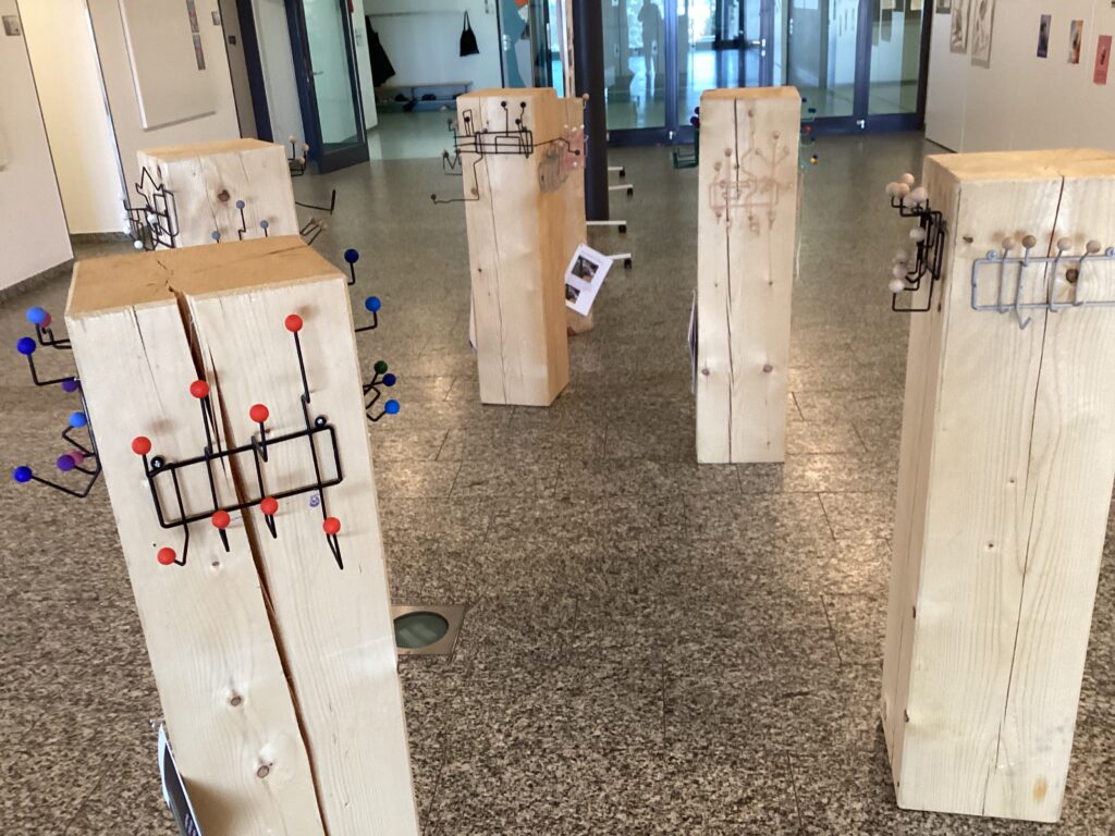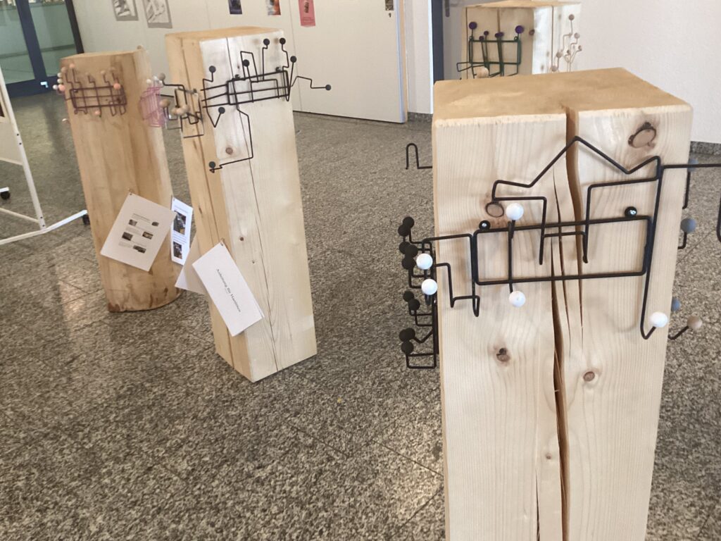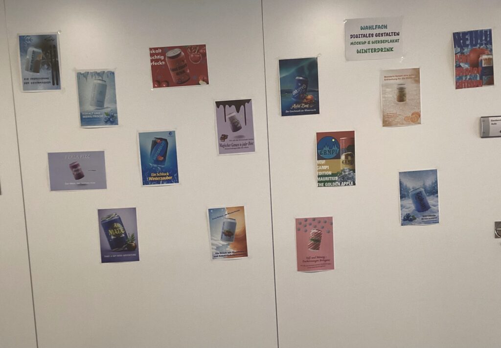 Beim Eingang unseres Schulhauses gibt es eine Ausstellung mit Arbeiten aus TTG, BG und dem Wahlfach Digitales Gestalten. Es wurden kleine Metallbügel ausgestellt, dazu Plakate, Zeichnungen und Bilder. Im Wahlfach Digitales Gestalten haben Schülerinnen und Schüler erfundene Wintergetränke gestaltet. Ausserdem gab es noch andere kreative Sachen aus dem Unterricht zu sehen.